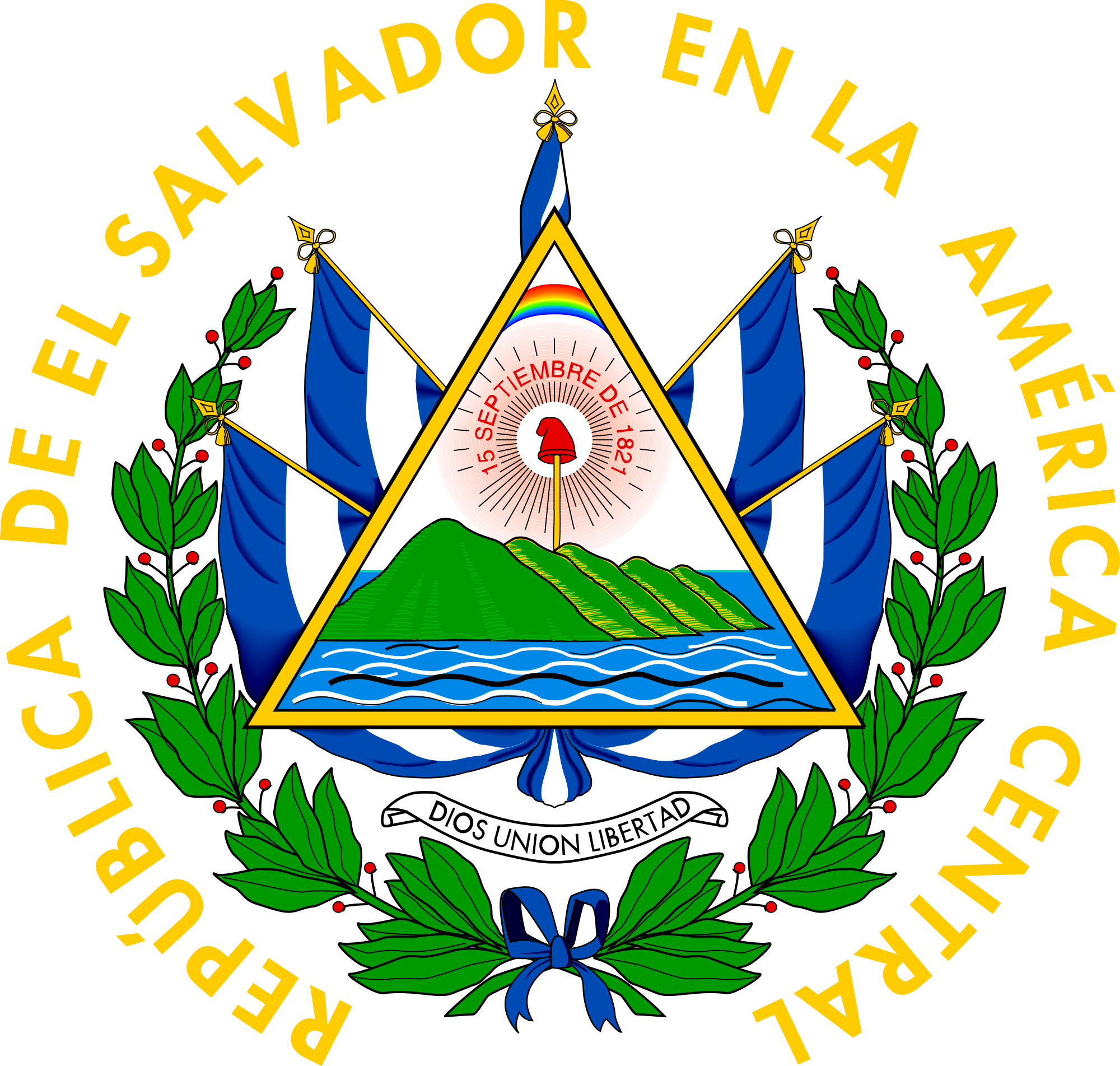 【國徽】三角形國徽表示平等、真理、正義。5座高聳的綠色山峰,象徵原來中美洲聯邦的5個成員國「宏都拉斯,瓜地馬拉,尼加拉瓜,薩爾瓦多,哥斯大黎加」,山峰下面的藍色象徵太平洋和加勒比海。山巔豎著一根竿,竿上是一頂紅色「自由之帽」 ,周圍「1821年9月15日(15 SEPTIEMBRE DE 1821)」的西班牙語字樣在光芒照耀中清晰可見。藍、黃、紅彩虹位於三角形的上角。兩旁為國旗 ,下面白色飾帶以西班牙語書寫「上帝、團結、自由(DIOS UNION LIBERTAD)」,整個圖案以綠葉環繞,綠枝下端以藍色帶繫束。黃色「中美洲薩爾瓦多共和國(REPÚBLICA DE El SALVADOR EN LA AMÉRICA CENTRAL)」環繞整個圖案。 【位置】位於中美洲北部。東北部與宏都拉斯交界,西北部與瓜地馬拉接壤,南瀕太平洋。 【人口】6,481,102人(2020年)。 【語言】官方語言為西班牙語,納華語爲地方語言。 【宗教】主要為天主教。 |