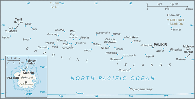 【國名】密克羅尼西亞聯邦 Federated States of Micronesia 【首都】帕里喀 Palikir 【面積】702平方公里 【國旗】該國由數各小島所組成的,藍色代表太平洋,四個星星代表四個主要的島嶼,即雅浦、楚克、波納佩、科斯雷 。 【國徽】國徽是圓形,中心圖案為椰子浮在海上。背景為四顆白色五角星,代表四個州:雅浦、楚克、波納佩、科斯雷。飾帶以英語書有國家格言「和平、團結、自由(PEACE UNITY LIBERTY)」。下方「1979」為聯邦成立的年份。外環以英文書以「密克羅尼西亞聯邦政府(GOVERNMENT OF THE FEDERATED STATES OF MICRONESIA)」。 【位置】位於北太平洋,屬加羅林群島,東西延伸2500公里。 【人口】102,436人(2020年)。 【語言】官方語言為英語。 【宗教】居民信奉基督教。 |